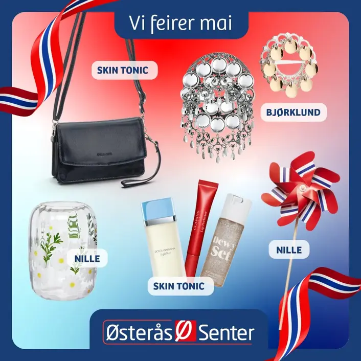 - Parfyme, rød leppestift og settingspray fra Skin Tonic – for en look som varer fra flaggheising til festmiddag.