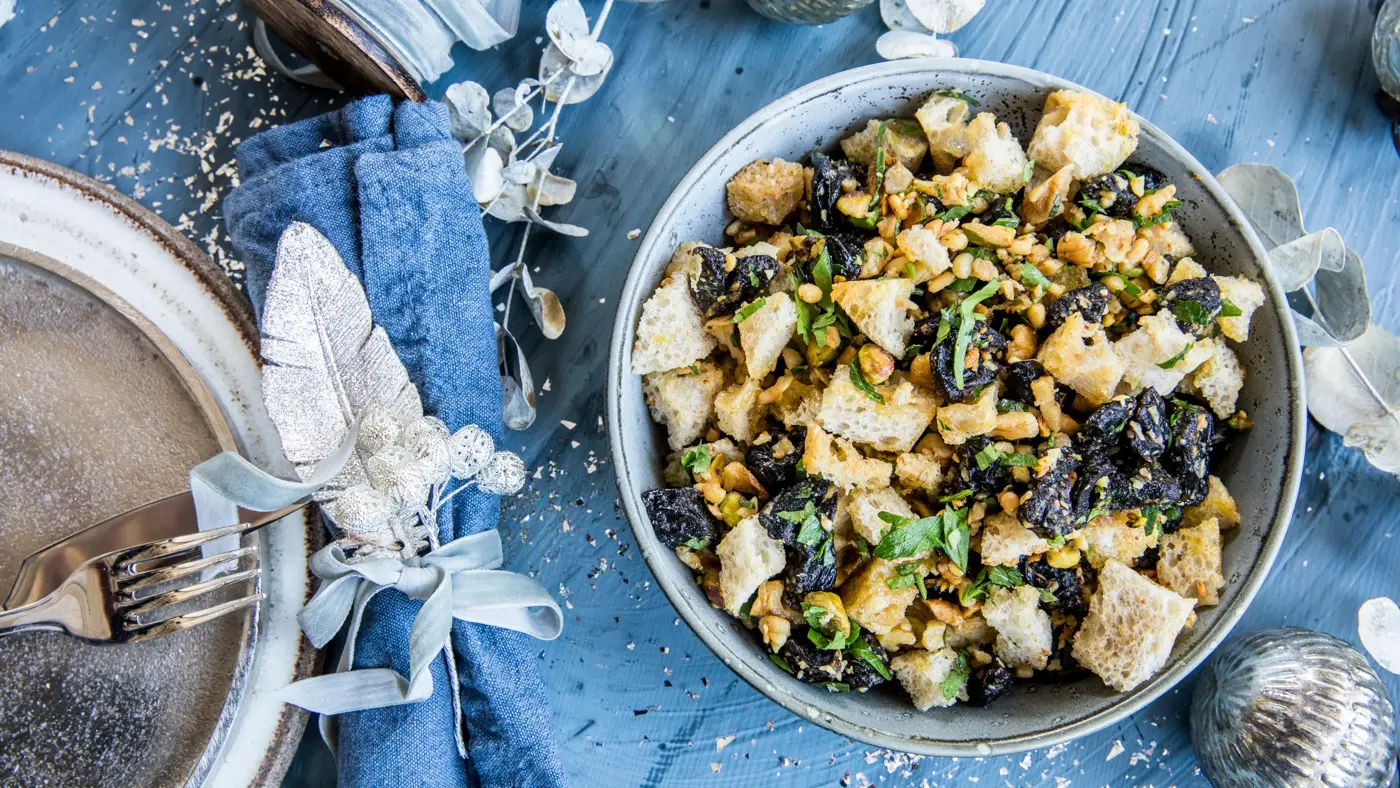 - Bland sammen brød, nøtter og frukt i en stor bolle. Smak til med salt, pepper og grovhakket persille.